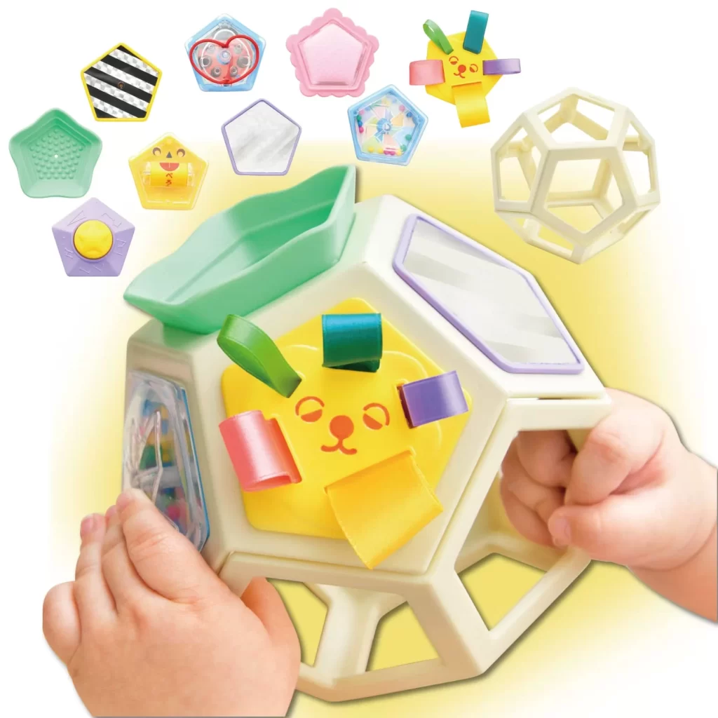 5つの面で様々な仕掛けが施された複合遊びおもちゃです。8個のカラフルなブロックで形合わせ、色合わせやメロディーに合わせてライトアップ機能、ぱたぱた絵本をめくるとABCの歌や数え歌も流れます。押したダイヤルの色や数をバイリンガル(日本語と英語)でおしゃべりします。遊びながら英語と日本語を学べる知育玩具で、五感・創造力・好奇心・思考力を育む力をサポート。