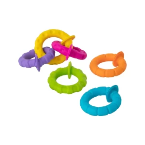 カラフルなリングが連なった遊び心満載の歯固めです。リング同士をくっつけて遊ぶことができるため、手先遊びをしながら触覚を刺激できます。また、吸盤がついているのでテーブルやお風呂の壁につけたりして遊ぶこともできます。