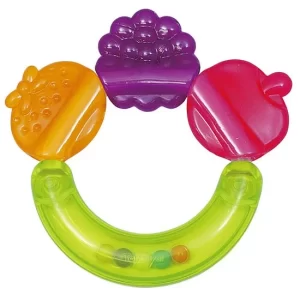 りんご、オレンジ、ぶどうのフルーツモチーフが可愛らしい歯固めです。3種類の異なる噛み心地が楽しめて、バナナ型の持ち手を振るとシャカシャカと音が鳴ります。軽量タイプのため、生後2か月から使えます。