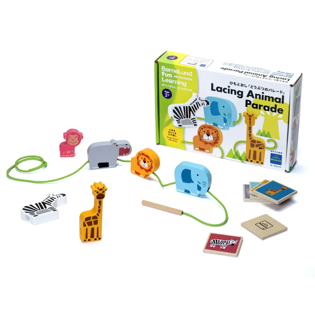 動物の形をした木のパーツに、ひもを通して遊ぶ「動物のパレード」は、はじめての紐通しにもぴったりなおもちゃです。