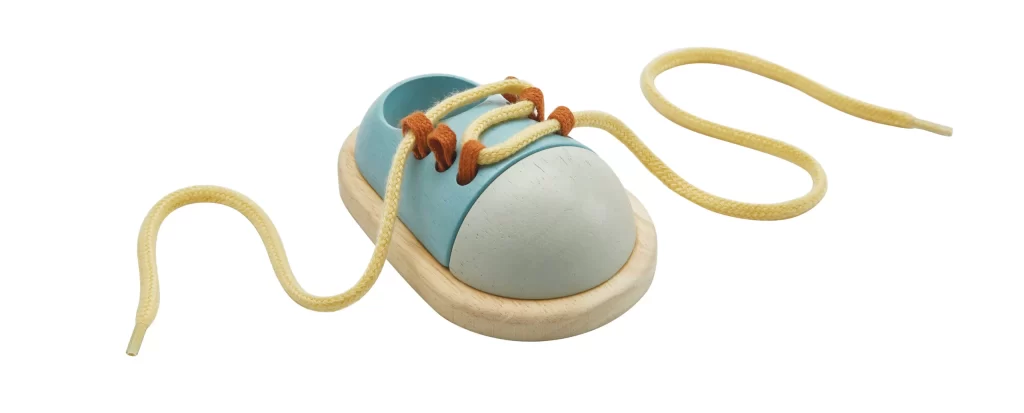 木でできた靴型の本体に、紐を穴に通したり抜いたりして遊ぶことで、指先の巧緻性や集中力が自然と育まれます。