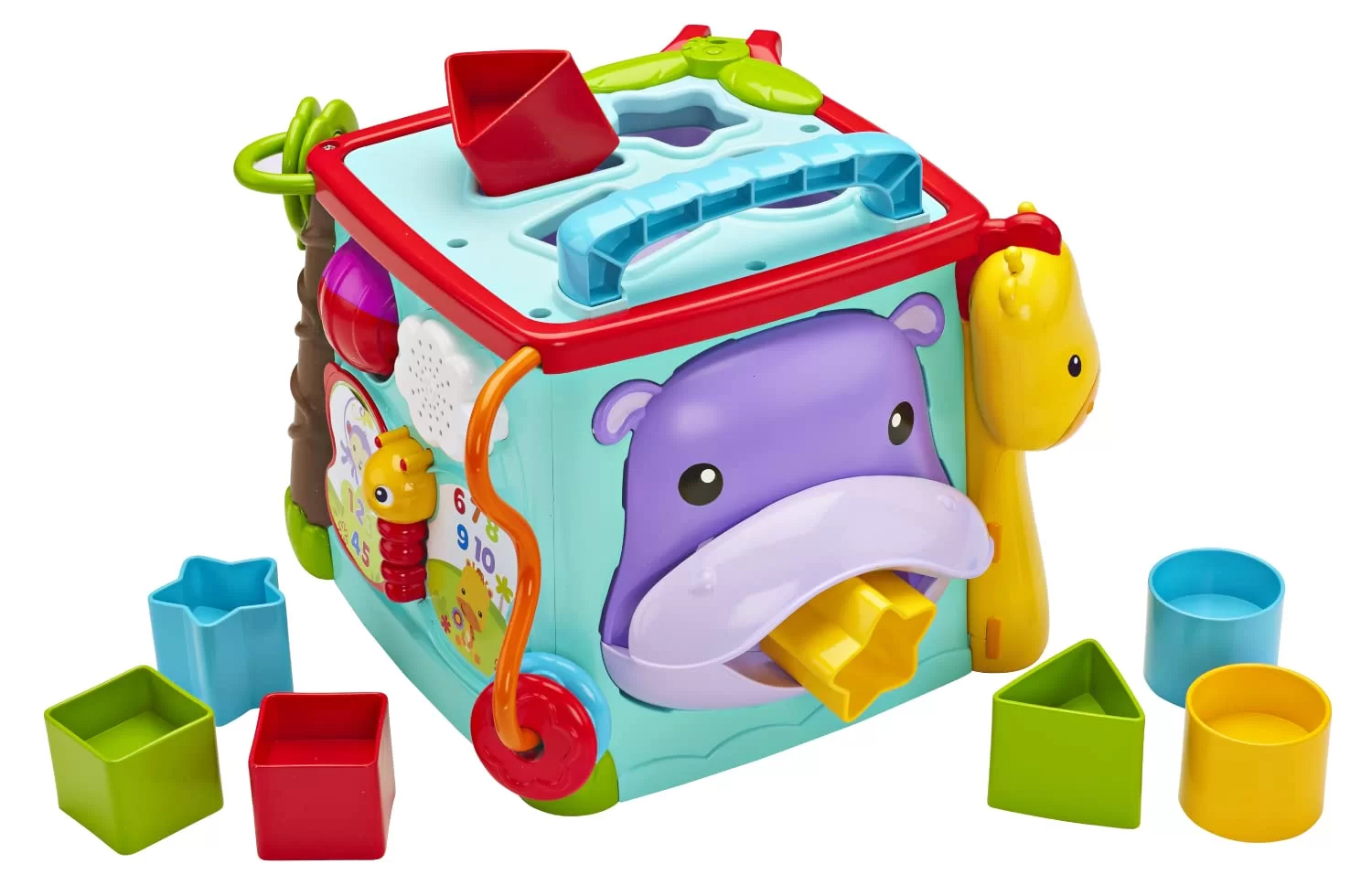 5つの面に様々な仕掛けがある複合遊びおもちゃで、日本語と英語のバイリンガル機能付きです。8個のカラフルなブロックを使った形合わせや、押したボタンの色や数字を音で教えてくれるダイヤル、メロディに合わせてライトアップする機能があります。ぱたぱた絵本をめくるとABCの歌や数え歌が流れ、ライオンを押すといないいないばぁで反応します。指先の微細運動を促しながら、色・数・形の認識力を育み、言語の発達をサポートします。