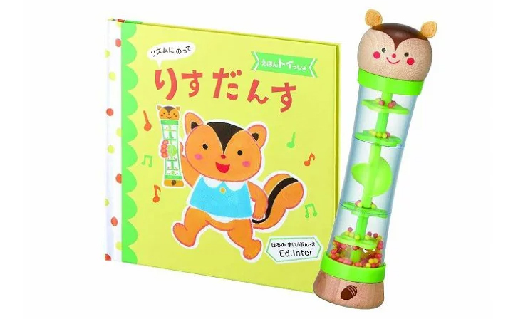 絵本とおもちゃで親子で楽しくリトミックができるセットです。大きな文字で読みやすい絵本は、声に出して楽しいテンポのいいフレーズがたくさんで、思わずまねしたくなるかわいいダンスが描かれています。まずは読み聞かせ、大人が踊って見せる、子どもが真似して踊る、おもちゃを使って踊るというように成長にあわせて遊べて、リズム運動に特化した内容となっています。