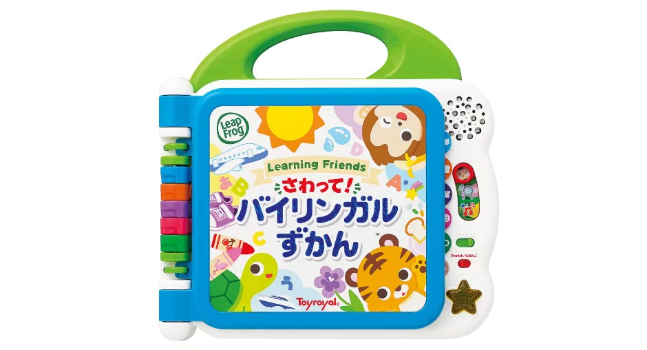 指で触るだけで日本語と英語をおしゃべりする図鑑で、タッチペン不要で簡単に遊べます。全12ページにサウンド85種類以上、ことばが460種類以上収録されており、日本語と英語を切り替えて別々に聞くことができます。星のメロディボタンを押すとボタンがピカピカ光って2曲の愉快な歌が流れます。絵をタッチすることで動物の名前や鳴き声が音声で出てくるので、言葉の発達を促し、英語モードに切り替えると英語脳・英語耳を鍛えられます。便利な取っ手付きでどこにでも持ち運びができます。