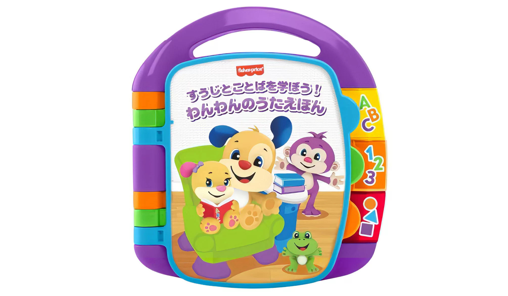ことば、色、数字を6つのうたで学べる絵本で、ページをめくるとわんわんがおしゃべりします。有名な童謡が流れて音楽に触れることができ、ABCボタンでは英語の言葉を、すうじのボタンでは絵本に登場するものの数を、形と色のボタンでは形や色の名前をおしゃべりします。破れない丈夫な素材でできており、ハンドル付きなので持ち運びにも便利です。ページをめくって、ボタンを押して、わんわんと一緒に学んで歌いながら、耳と目ではじめてのことばを学べます。